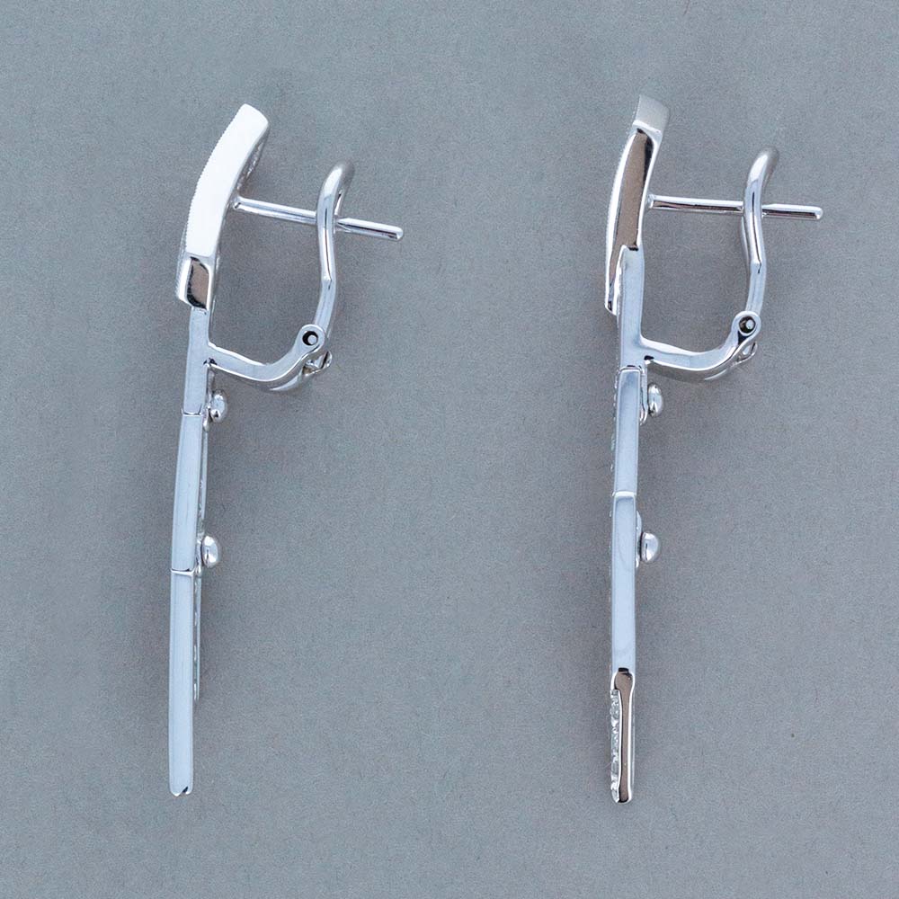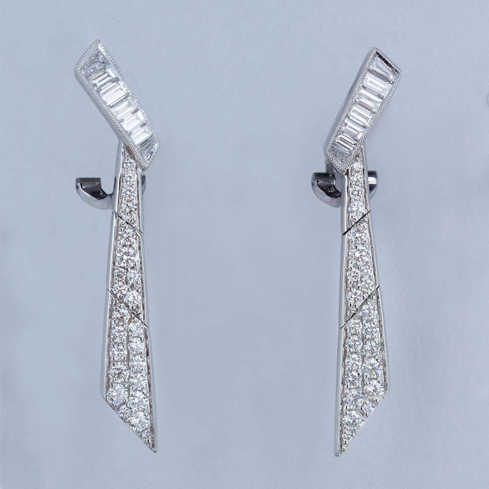 WHITE GOLD ART DECO INSPIRED EARRINGS WITH ROUND BRILLIANT CUT AND BAGUETTE DIAMONDS, ON POSTS WITH OMEGA BACKS