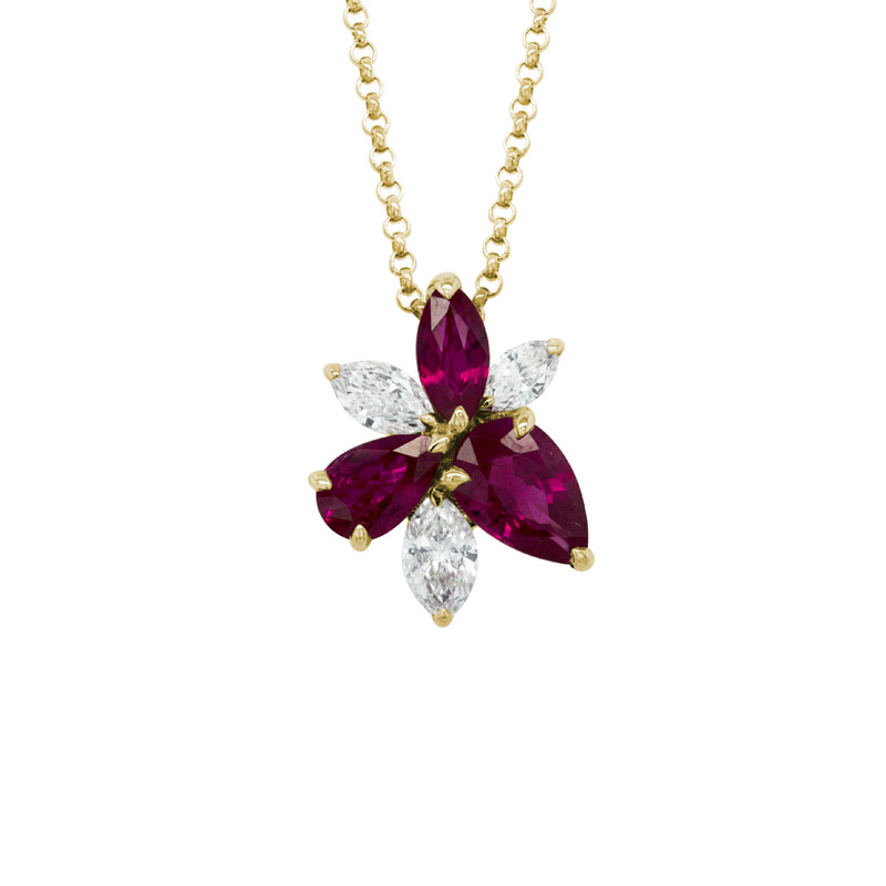 Pendant features marquise & pear shape rubies and marquise shape diamonds